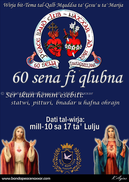 Il-Kummissjoni Zghazagh ser torganizza Wirja ohra mill-isbah bit-tema tal-Qalb Mqaddsa ta' Gesu' u ta' Marija bl-isem ta' 60 sena fi qlubna. F'din il-wirja ser jkun hemm esebiti bosta xoghlijiet ta' artisti lokali fosthom statwi, pitturi, bnadar u hafna ohrajn. Il-wirja ser tkun miftuha ghall-pubbliku mill-10 sa 17 ta' Lulju.