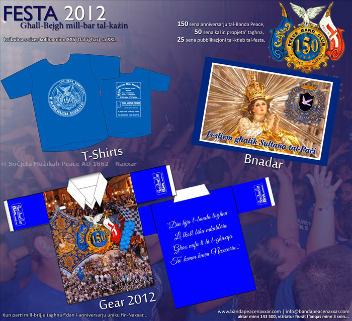 Festa ohra regghet waslet u din is-sena l-Kummissjoni Zghazagh fl-okkazjoni tal-150 sena anniversarju tal-banda taghna ddisinjat gear tal-festa u ser ikun ghall-bejgh dalwaqt. Bhall-kull sena ohra, l-Kummissjoni Zghazagh tohrog ukoll it-T-Shirt li jintlibes mill-partitarji ghall-waqt il-brijju, kif ukoll din is-sena qieghda tinbiegh bandiera mill-isbah. Aktar ddetalji tistghu ssibuwom fuq dan is-sit aktar tard.