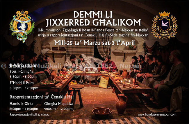 Issa kif qieghed joqrob zmien il-Gimgha Mqaddsa, l-Kummissjoni Zghazagh fi hdan is-Socjeta' Muzikali Peace ser jergaw ittellghu zewg rapprezentazzjonijiet tac-Cenaklu Haj fin-Naxxar nhar Hamis ix-Xirka u nhar il-Gimgha l-Kbira. Il-Kummissjoni Zghazagh din is-sena qeghda ticcelebra l-20 sena mit-twaqqif taghha u hadet l-inizjattiva li ghat-tieni sena konsekuttiva ttella' din ir-rapprezentazzjoni b'mod volontarju ghal pubbliku li hu mistieden jattendi ghaliha fiz-zmien il-Gimgha Mqaddsa. "DEMMI LI JIXXERRED GHALIKOM" hija t-tema maghzula ghal din is-sena ghal Wirja u rapprezentazzjoni Hajja tal-ahhar ikla ta' Sidna Gesu' Kristu li se ssir fil-kantina tal-kazin.