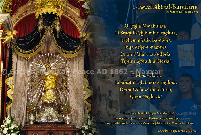 Illum is-Sibt 11 ta' Lulju huwa propju l-ewwel Sibt tal-Festa ta' Marija Bambina fin-Naxxar. Nheggu lin-Naxxarin kollha specjalment lill-partitarji tal-Banda Peace sabiex ittellghu l-bnadar u jixghelu t-tubi u l-globi taghhom f'din l-okkazjoni.