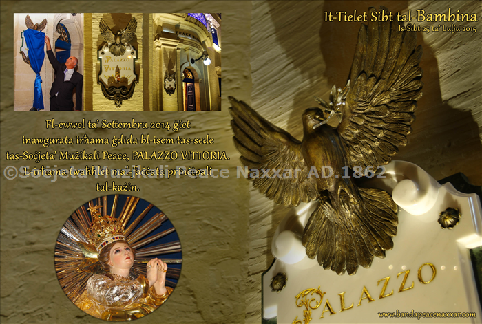 Wasal it-Tielet Sibt tal-Festa ghaziza taghna ta' Marija Bambina, u f'dan is-Sibt nixtieq infakkarkom fl-innawgurazjoni tal-irhama l-gdida bl-isem tas-sede tas-Socjeta' Muzikali Peace, PALAZZO VITTORIA li kienet saret fl-ewwel ta' Settembru 2014. Din l-irhama twahhlet mal-faccata principali tal-kazin fejn qieghda tidgawda minn kull min izur is-sede taghna u l-pjazza tan-Naxxar.