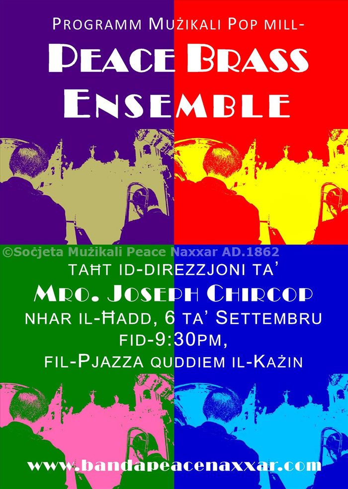 Ninsabu biss xahar il-boghod mill-Programm Muzikali Pop organizzat mill-PEACE BRASS ENSEMBLE li ser isir nhar il-Hadd 6 ta' Settembru fid-9:30pm fil-pjazza quddiem il-kazin. Din is-sena ghal l-ewwel darba dan il-Programm ser jitmexxa taht id-direzzjoni ta' Mro. Joseph Chircop fejn ser jindaqqu bosta siltiet famuzi fuq stil pop u hafna aktar.