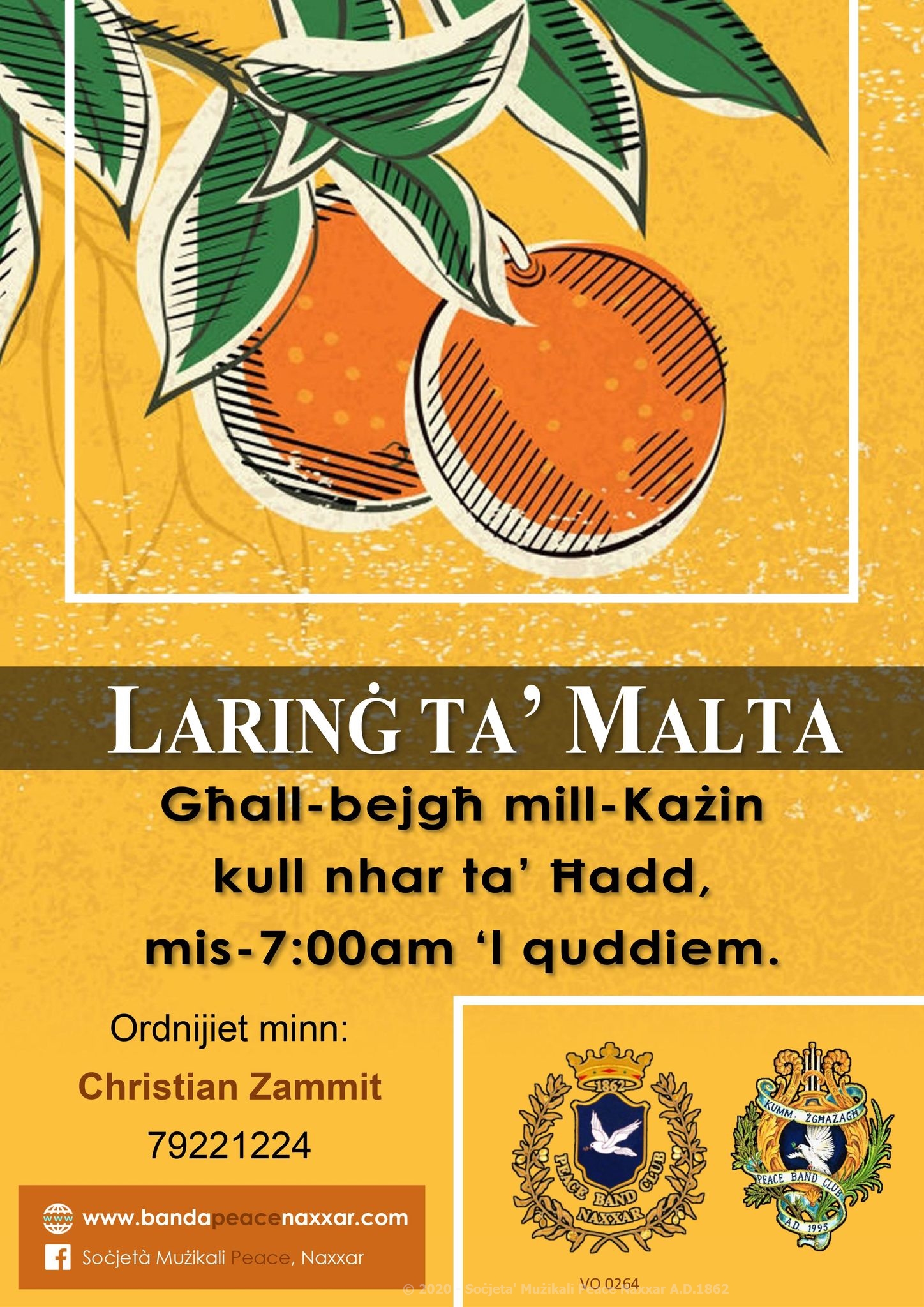 Il-membri tal-Kummissjoni Żgħażagħ fi ħdan is-Soċjeta' għal sena oħra ser ikunu qiegħdin ibiegħu l-larinġ ta' Malta kull nhar ta' Ħadd mis-7:00am 'l quddiem minn ġol-każin. Għal ordnijiet tistaw tikkuntatjaw lis-sur Christian Zammit fuq 7922 1224.