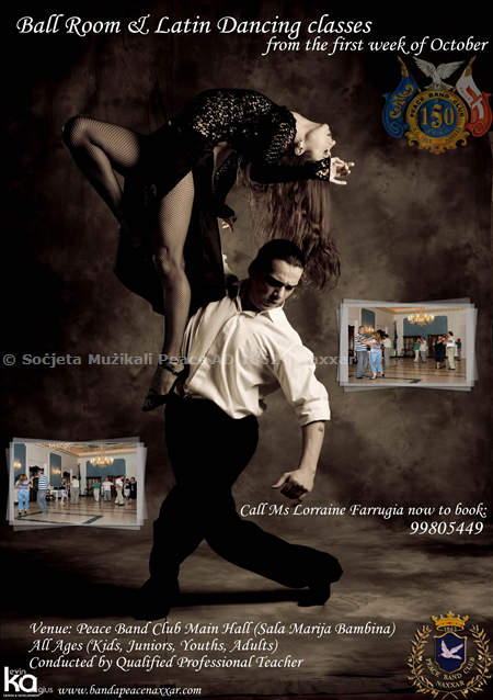 Is-Socjeta' Muzikali Peace stidnet lill ghalliema kwalifikata u professjonali Ms Lorraine Farrugia sabiex minn Ottubru li gej tibda taghti l-lezzjonijiet taz-zfin (Ballroom & Latin Dancing) fis-Sala Principali tal-Kazin (Sala Marija Bambina).