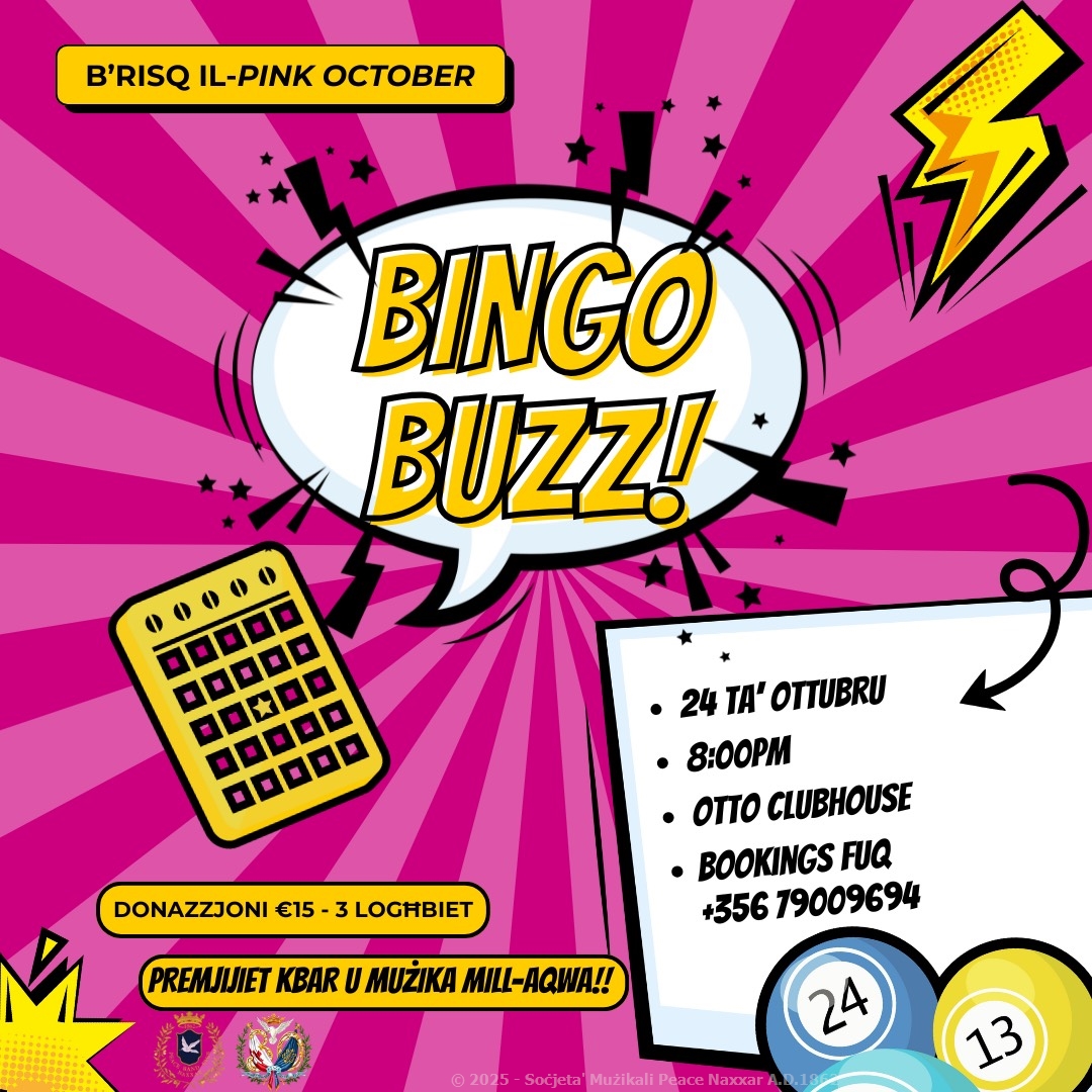 Nhar il-Ġimgħa, 24 ta’ Ottubru, mit-8:00pm ’il quddiem, il-Kummissjoni Żgħażagħ ser torganizza Bingo Buzz b’risq Pink October ġewwa OTTO Clubhouse.