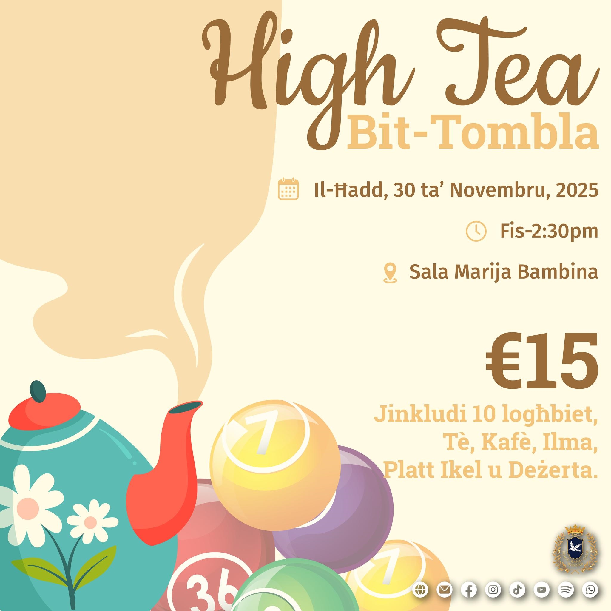 Nhar il-Ħadd, 30 ta’ Novembru, fis-2:30pm, is-Soċjetà Mużikali Peace ser torganizza High Tea fis-Sala Marija Bambina ġewwa Palazzo Vittorja. Kull min hu interessat li jattendi huwa ġentilment mitlub jikkuntattjana fuq 79960520 jew ibukkja minn OTTO Clubhouse.