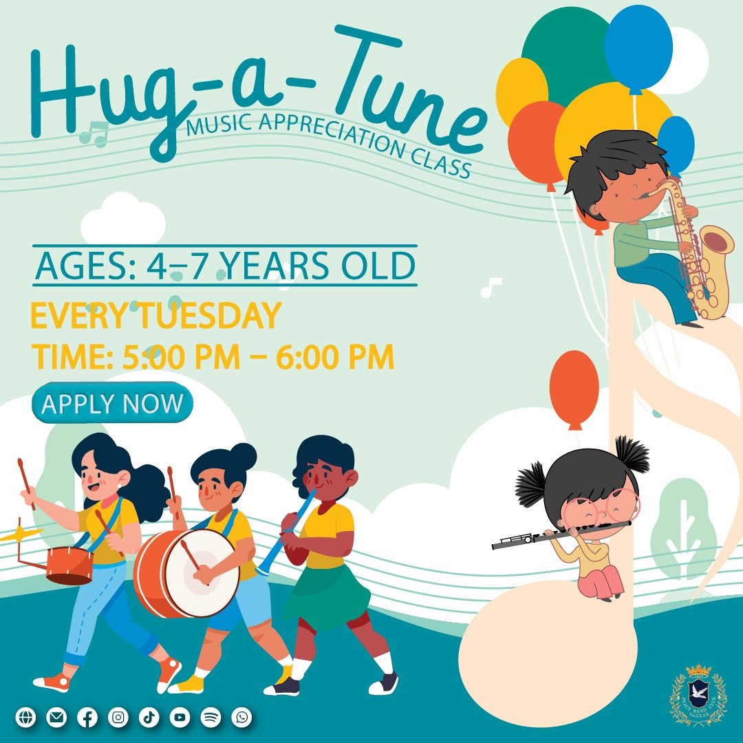 Hug-a-Tune hija klassi tal-mużika mfassla apposta għat-tfal żgħar. Din l-inizjattiva toffri ambjent pożittiv u stimolanti fejn idejn żgħar, qlub kbar u moħħijiet kurjużi jingħaqdu flimkien biex jesploraw u japprezzaw il-maġija tal-mużika.