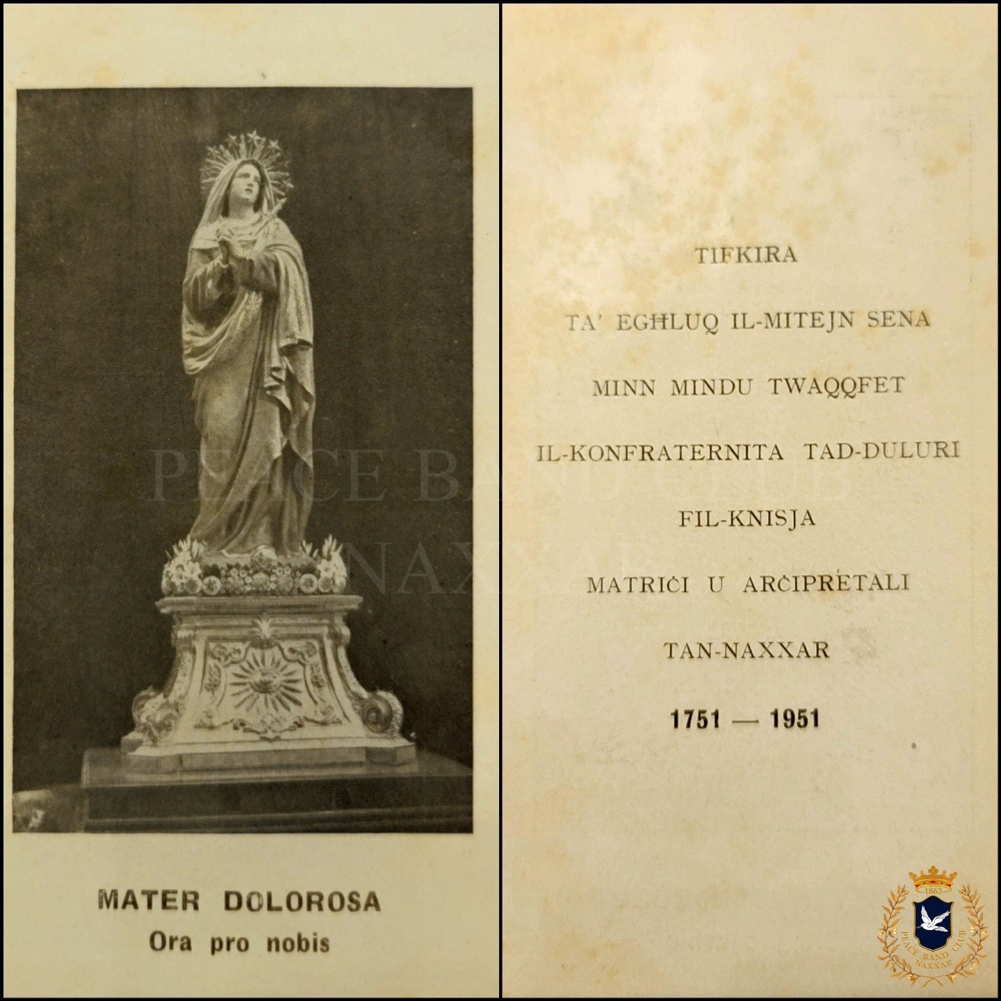 Il-Konfraternità tad-Duluri tan-Naxxar twaqqfet 275 sena ilu, lura fl-1751, u matul iż-żmien saret parti importanti mill-ħajja reliġjuża u kulturali tan-Naxxar. Din il-fratellanza tradizzjonali kienet marbuta mill-qrib mal-parroċċa, b’devozzjoni speċjali lejn il-Madonna tad-Duluri, u twaqqfet bil-għan li tippromwovi l-qima lejn Marija Addolorata.