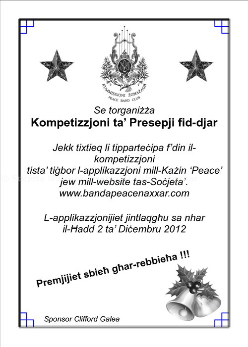 Ser tigi organizzata Kompetizzjoni ta' Presepji fid-djar mill-Kummissjoni Zghazagh Peace. Jekk tixtieq li tippartecipa f'din il-kompetizzjoni tista' tigbor l-applikazzjoni mill-Kazin tal-Peace jew mill-website tas-Socjeta' - www.bandapeacenaxxar.com.