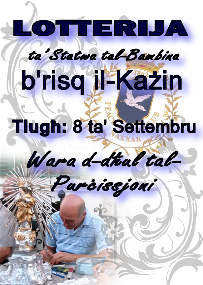Nixtiequ ninfurmawkom li ser issir lotterija ghar replika tal-vara titulari ta' Marija Bambina tan-Naxxar. Il-biljetti jistghu jinxtraw mill-kazin ghal prezz ta' €1 il-biljett. Minn jixtri hames biljetti, jinghata wiehed b'xejn.