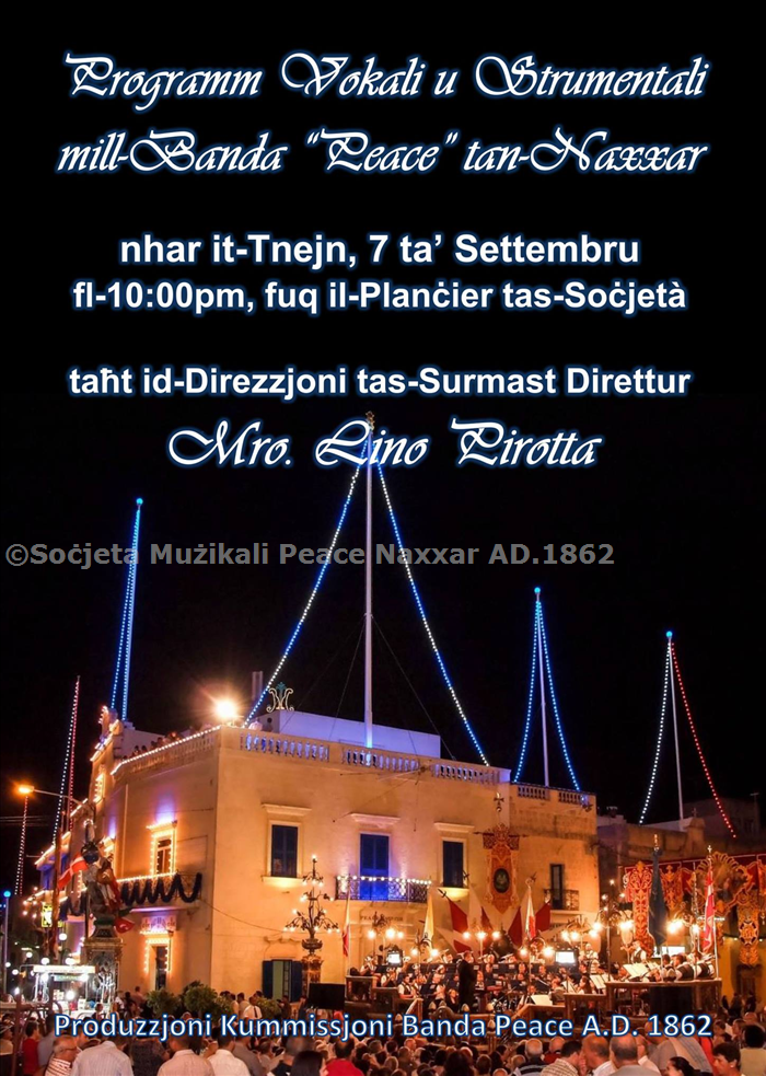 Ninsabu xahar il-boghod mill-Programm Muzikali ferm mistenni minn kullhadd li jsir mill-Banda Peace fuq il-plancier majestuz tas-Socjeta' taghna. Dan huwa l-unika plancier fin-Naxxar u jintrama propju fil-pjazza quddiem il-kazin. Il-Programm Muzikali taht id-Direzzjoni tas-surmast Naxxari, Mro. Lino Pirotta ser jittella' nhar it-Tnejn 7 ta' Settembru fl-10:00pm.
