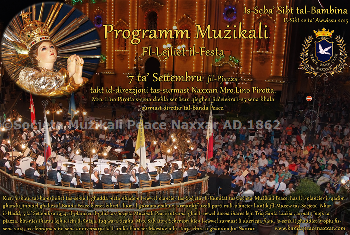 Nixtieq nahtaf l-opportunita' sabiex nheggeg lin-Naxxarin kollha specjalment lill-partitarji tas-Socjeta' Muzikali Peace sabiex ittellghu l-bnadar, tubi u globi taghhom fl-okkazzjoni tas-Seba' Sibt tal-Festa ta' Marija Bambina. Nixtieq ukoll nheggigkom tattendu ghal attivitajiet li jmiss li huma propju l-Hrug minn-nicca tal-vara ta' Marija Bambina nhar il-Gimgha 28 ta' Settembru u l-BBQ Kbir fil-Pjazza li ser isir nhar il-Hadd 30 ta' Settembru. Bookings mill-membri tal-Kumitat/Kummissjonijiet kif ukoll mill-operaturi tal-BAR OTTO CLUBHOUSE. Bookings miftuhin, thallux ghal ahhar!