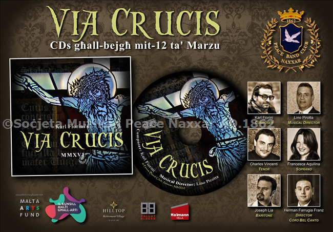 Nhar is-Sibt 12 ta' Marzu propju wara l-PREMIERE ferm mistennija tal-VIA CRUCIS ser ikun qieghed isir il-bejgh tac-CDs ta' din il-Muzika Sagra li ser tkun ghadha kemm indaqqet gewwa l-Knisja Arcipretarja tan-Naxxar. Nhar il-Hadd 24 ta' Jannar beda r-recording ta' din il-Muzika Sagra, billi sar ir-recording tal-instrumenti, u wara bdew isiru r-recordings tal-vucijiet (Tenur, Baritonu, Sopran u l-kor) u propju ftit tal-jiem ilu ntemm fr-recording b'success kbir. F'din ic-CD ser tisimaw lill-Banda Peace jdoqqu kompozizzjoni ta' Karl Fiorini taht it-tmexxija tas-Surmast Direttur tal-Banda Peace, Mro. Lino Pirotta. Tenur Charles Vincenti, Soprano Francesca Aquilina, Baritone Joseph Lia, u l-Coro Bel Canto taht it-tmexxija tad-direttur Herman Farrugia Franz.