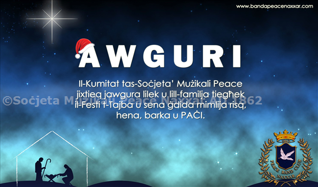 Il-Kumitat Ċentrali flimkien mall-Kummissjonijiet kollha tas-Soċjeta' Mużikali Peace, jixtiequ jawguraw il-Festi t-Tajba lil kullħadd b'modd speċjali lill-membri, bandisti, soċji, benefatturi, u helpers ta' din is-Soċjeta'. J'Alla ikollkom Milied u sena ġdida mimlija PAĊI, HENA, MĦABBA, u SAĦĦA.