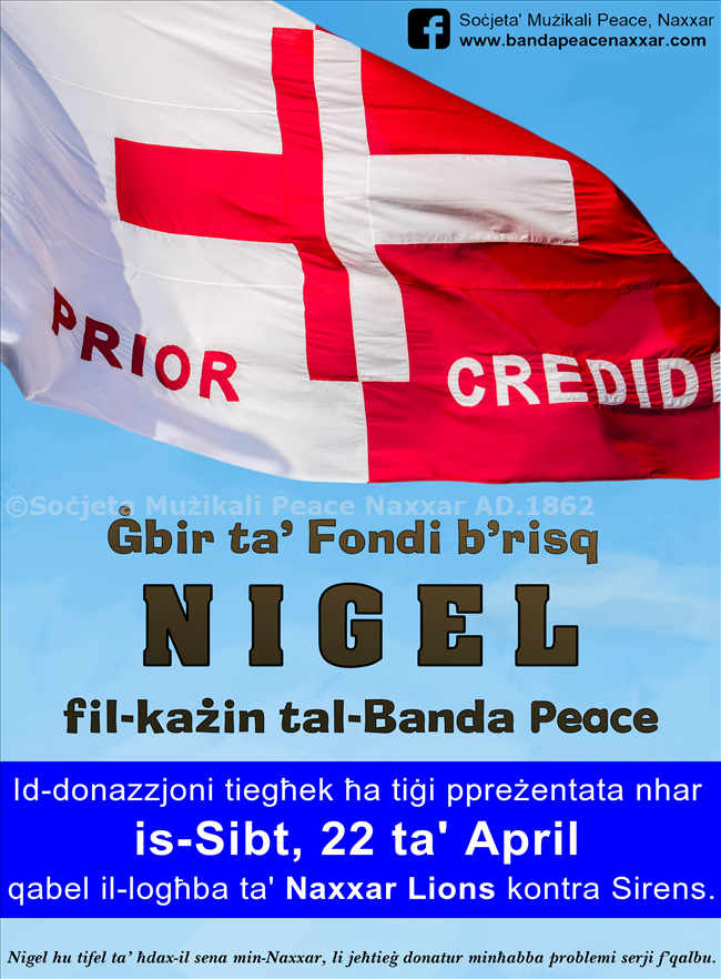Is-Socjeta' Muzikali Peace bhala Socjeta' li hija vicin il-poplu specjalment dak Naxxari, qieghdin nheggu lill-partitarji u membri ta' din is-Socjeta' sabiex kull minn jista jghin b'modd finanzjarjament lic-ckejken Nigel jista jaghmel dan billi jitfa d-donazzjoni tieghu fil-bott li hemm fuq il-bar tal-OTTO Clubhouse (bar tal-kazin).