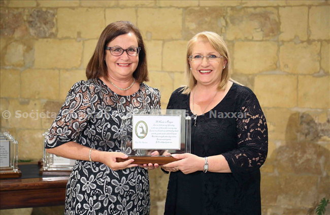 Ritratt: L-Eċċ President ta' Repubblika ta' Malta Marie-Louise Coleiro tagħti tifkira ta' rikonoximent lis-sinjura Angela Azzopardi.