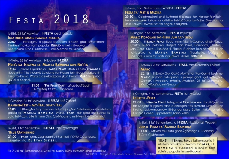 Illum qiegħdin nippublikaw id-djarju uffiċjali tal-attivitajiet kollha tas-Soċjeta' Mużikali Peace fil-Festa 2018 fejn fih aktar minn 10 attivitajiet. L-attivitajiet ser jibdew fit-25 ta' Awwissu b'Ikla kbira għall-familja kollha u tispiċċa nhar it-8 ta' Settembru fejn il-Banda Peace b'unur u privileġġ kbir ser tkun qiegħda takkumpanja l-istatwa artistika u devota ta' Marija Bambina waqt il-purċissjoni kollha bl-Innijiet Marjani tant sbieħ u popolari man-Naxxarin.