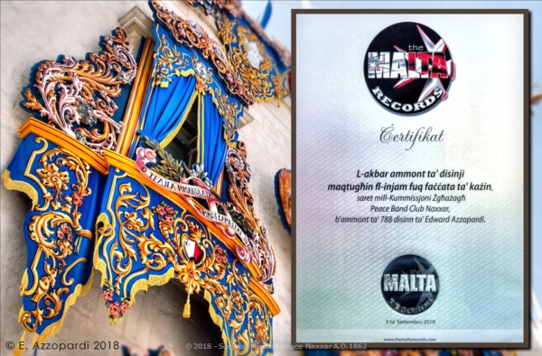 Diġa għaddiet ġimgħa minn mindu l-Kummissjoni Żgħażagħ fi ħdan is-Soċjeta' Mużikali Peace flimkien mal-artist u disinjatur tal-faċċata s-sur Edward Azzopardi ġew premjati mill-Malta Records għall-akbar ammont ta' disinji maqtugħin fl-injam fuq faċċata ta' każin b'ammont ta' 788 disinn fl-injam. Id-disinn tal-faċċata l-ġdida li ġiet inawgurata għall-ewwel darba fil-pjazza nhar it-Tnejn 3 ta' Settembru 2018, irrekjediet bosta xogħol, ħin u dedikazzjoni minn ħafna partitarji tas-Soċjeta' tagħna. Nistaw ngħidu li din il-faċċata saret kollha mill-partitarji tas-Soċjeta'. Id-disinn, ingrandimenti u xogħol tal-injam saru mis-sur Edward Azzopardi u x-xogħol tal-ħadid sar mis-sur Ryan Cauchi u s-sur Daniel Bonavia. Pero' mingħajr l-għajnuna tal-partitarji li kienu jgħinu kuljum sabiex il-proġett tal-faċċata jibqa' miexi l-quddiem, din il-ħolma ma kinetx isseħħ realta' dis-sena. Allura minn qalbna nixtiequ nirringrazzjaw lil kull individwu li kien jiġi b'mod volontarjat sabiex isir xogħol ta' xkatlar, żebgħa u qtugħ fl-injam u fil-ħadid. Nixtiequ fl-aħħar u mhux l-anqas nirringrazzjaw lill-artist Redrian Micallef tax-xogħol ta' sfurmar li għamel fuq id-drapp u d-disinni tal-injam.