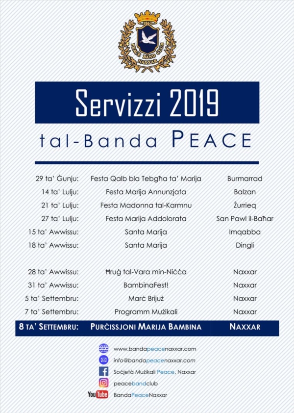 Bħal kull sena l-Banda Peace tkun ferm impenjata b'mod speċjali fl-istaġun tas-Sajf fejn il-banda tiġi mistiedna sabiex idoqq f'bosta servizzi mużikali fil-Festi Maltin.