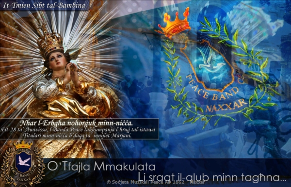 Nhar is-Sibt 24 ta' Awwissu huwa propju t-Tmien Sibt tal-Bambina, u ninsabu biss ftit jiem il-bogħod mill-Ħruġ minn-nicca tal-istatwa ta' Marija Bambina u għalhekk ma setax jonqos biex dan is-Sibt nidedikawħ lil ġawra tan-Naxxarin. Nhar l-Erbgħa 28 ta' Awwissu waqa l-quddies tas-7:00pm, il-banda Peace bħal kull sena bi privileġġ u unur kbir ser tkun qiegħda takkumpanja l-ħrug tal-Istatwa ta' Marija Bambina minn-Niċċa. Wara l-quddiesa, l-BANDA PEACE tiftaħ il-Festa b'Marċ li jibda mid-Dar Sagra Familja fi Triq il-Markiż Scicluna, sal-Pjazza fejn tilqa' l-Istatwa Titulari fil-bieb tal-Knisja. Dan is-servizz huwa rregalat lill-Festa minn din is-Soċjeta'. Wara ċ-ċelebrazzjoni jkun hemm Marċ Brijjuż fil-Pjazza u Vjal ix-Xogħol.