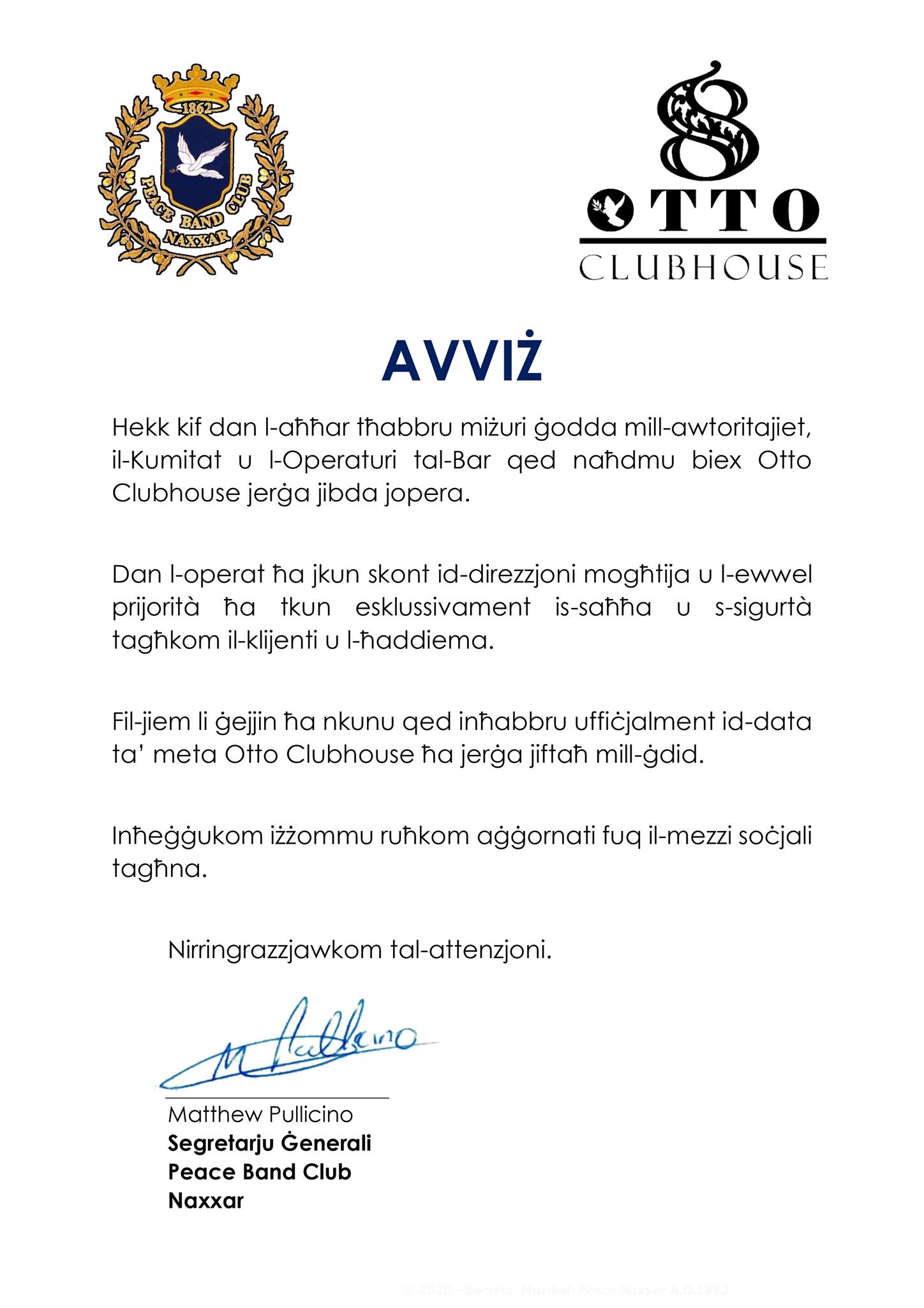 Hekk kif dan l-aħħar tħabbru miżuri ġodda mill-awtoritajiet, il-Kumitat u l-Operaturi tal-Bar qed naħdmu biex OTTO Clubhouse jerġa jibda jopera.