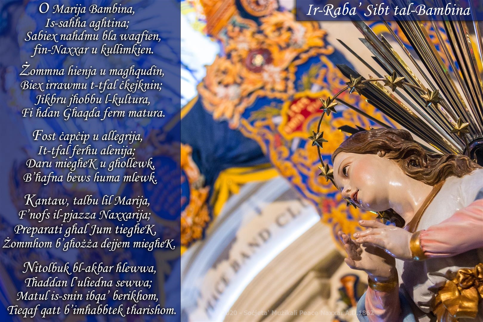 Illum ninsabu fl-ewwel Sibt ta' Awwissu, u aktar kemm jgħaddi żmien, aktar qiegħdin noqorbu għal Festa għażiża tagħna ta' Ommna Marija Bambina. Illum qiegħdin llkoll flimkien niċċelebraw ir-Raba' Sibt tal-Festa. F'dan is-Sibt xtaqna naqsmu ftit strofi minn poeżija sabiħa oħra fejn qiegħdin nitolbu lill Ommna Marija Bambina sabiex iżżomm ideha fuq it-tfal tagħna u sabiex tgħina inrawwmu t-tfal jikbru jħobbu l-kultura.